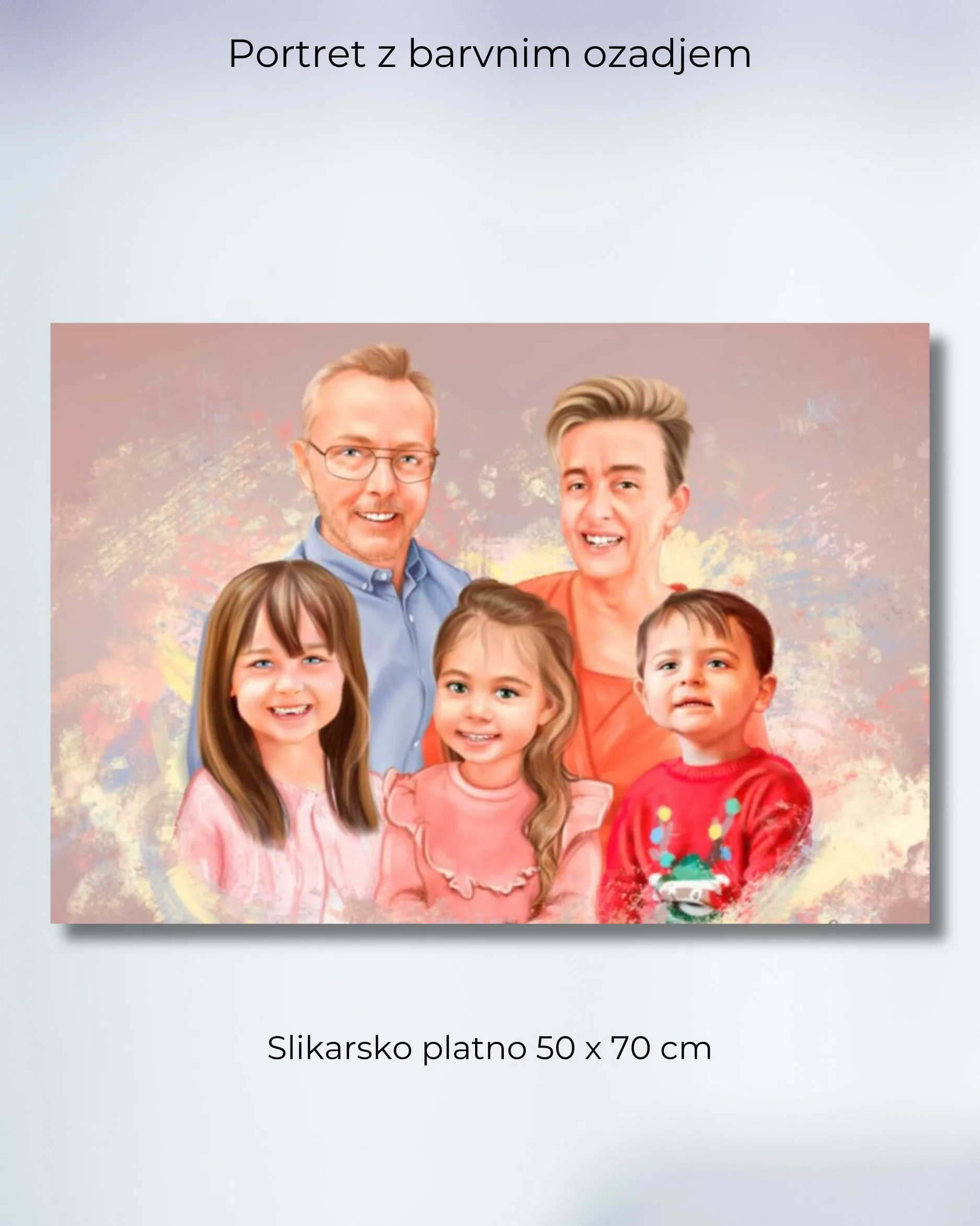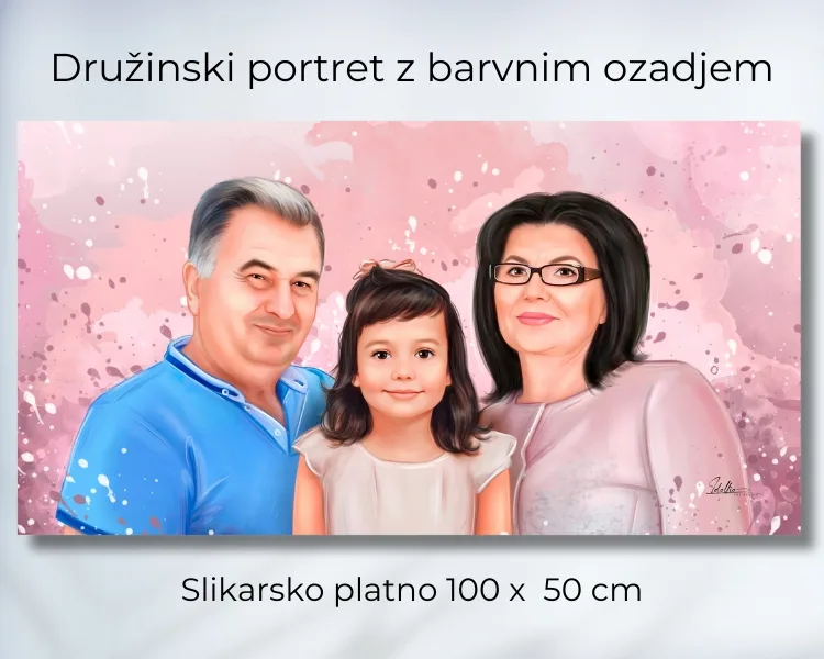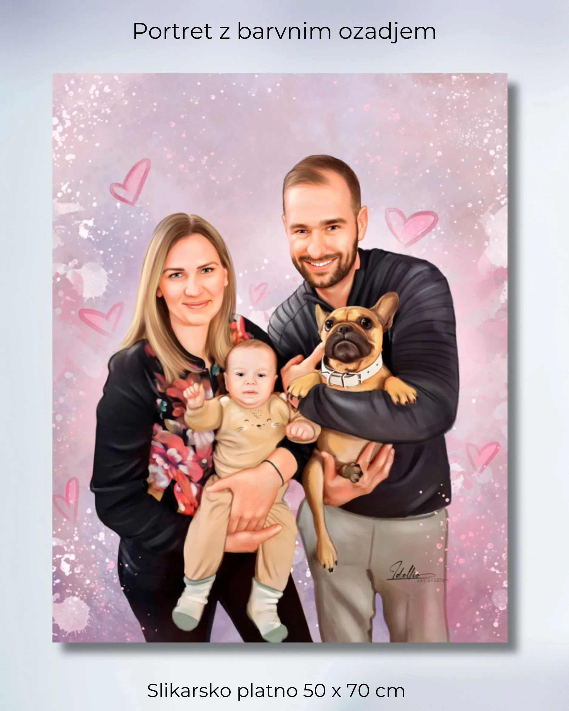 Osnovna cena portreta je objavljena na vrhu strani. Ta cena vključuje risbo portreta 1 osebe z neomejenim številom podrobnosti v ozadju, velikost platna 20 x 30 cm in standardno hitro proizvodnjo (10 - 14 dni) z brezplačno dostavo. Prilagojeno vašim željam!