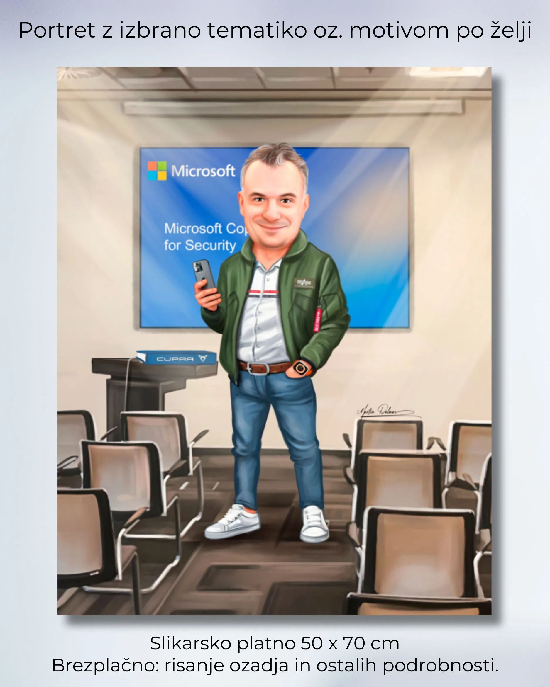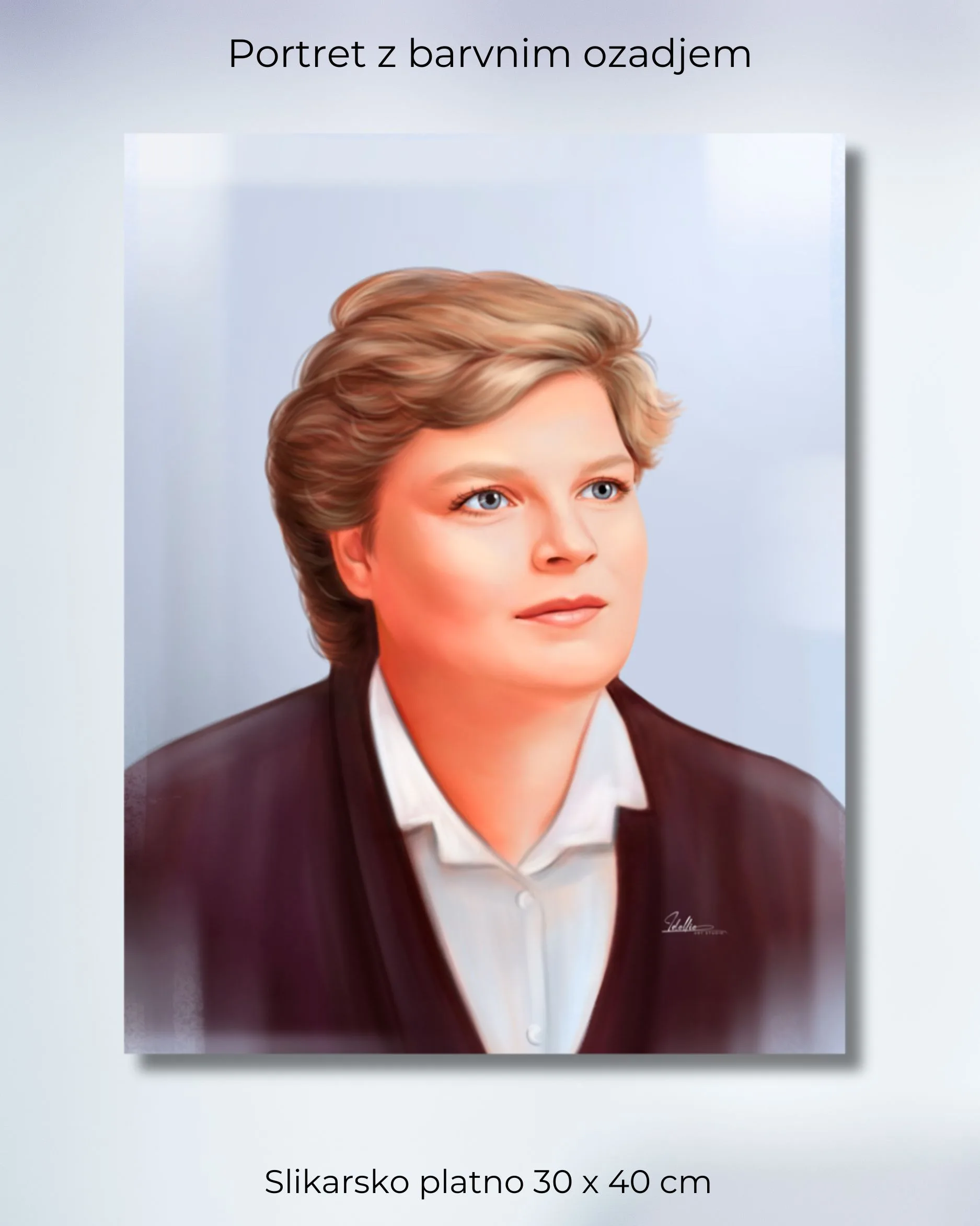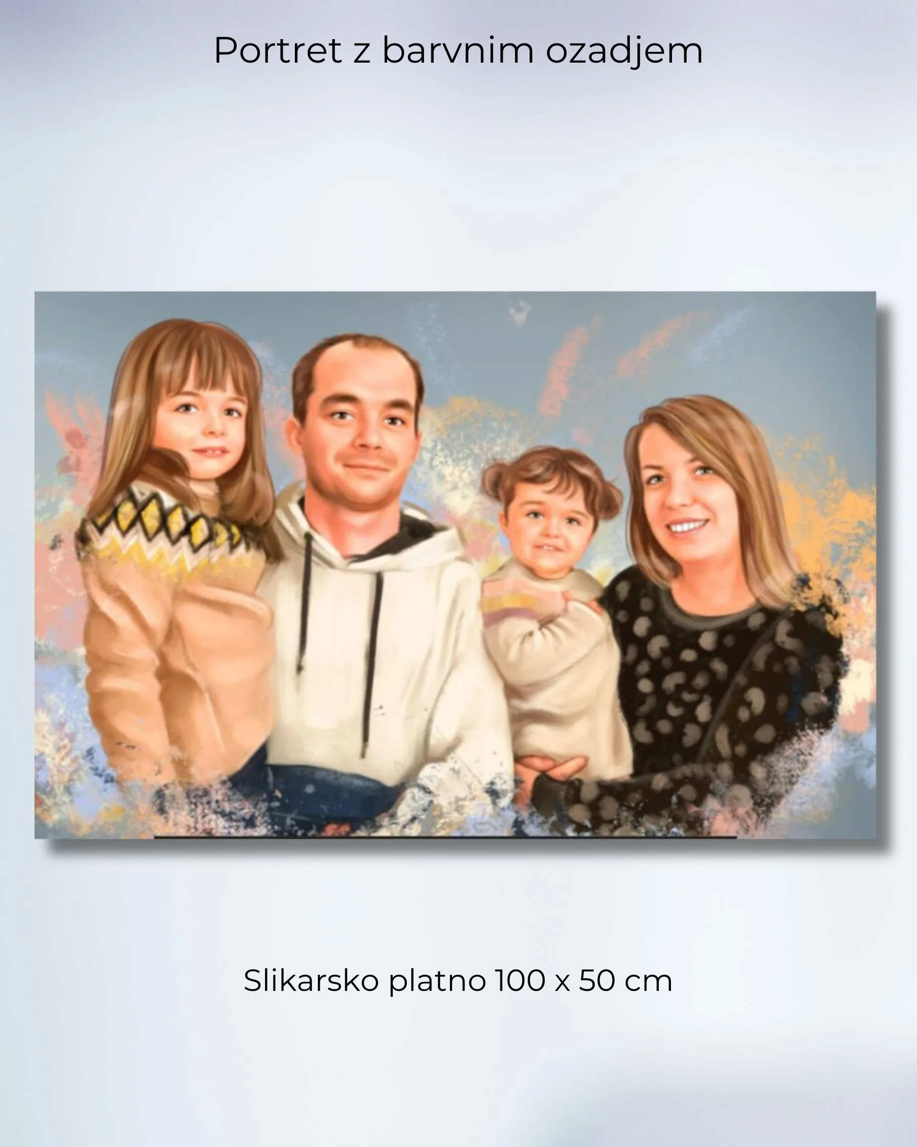 Osnovna cena portreta je objavljena na vrhu strani. Ta cena vključuje risbo portreta 1 osebe z neomejenim številom podrobnosti v ozadju, velikost platna 20 x 30 cm in standardno hitro proizvodnjo (10 - 14 dni) z brezplačno dostavo. Prilagojeno vašim željam!